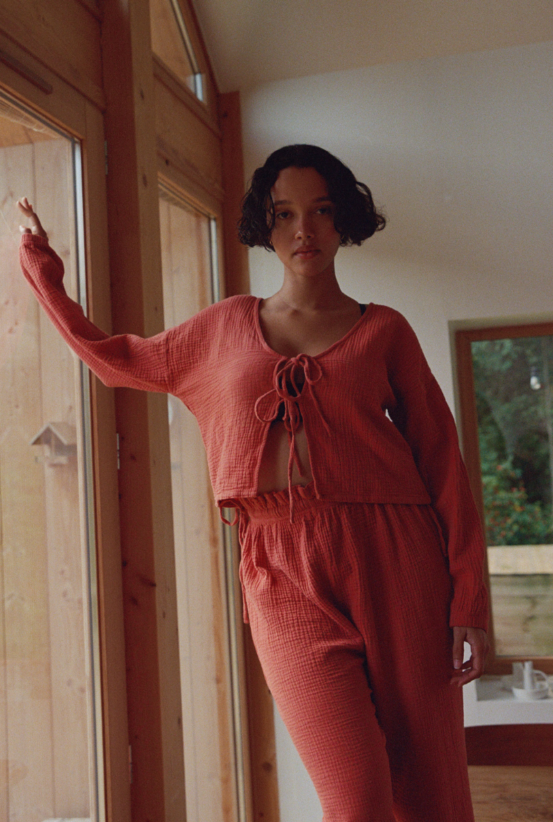 This is the new homewear cut from this drop. Still in ultra-soft organic cotton gauze, these pajamas to wear together or mismatched are a real hit in the team. We love it for its game of ties to tie.