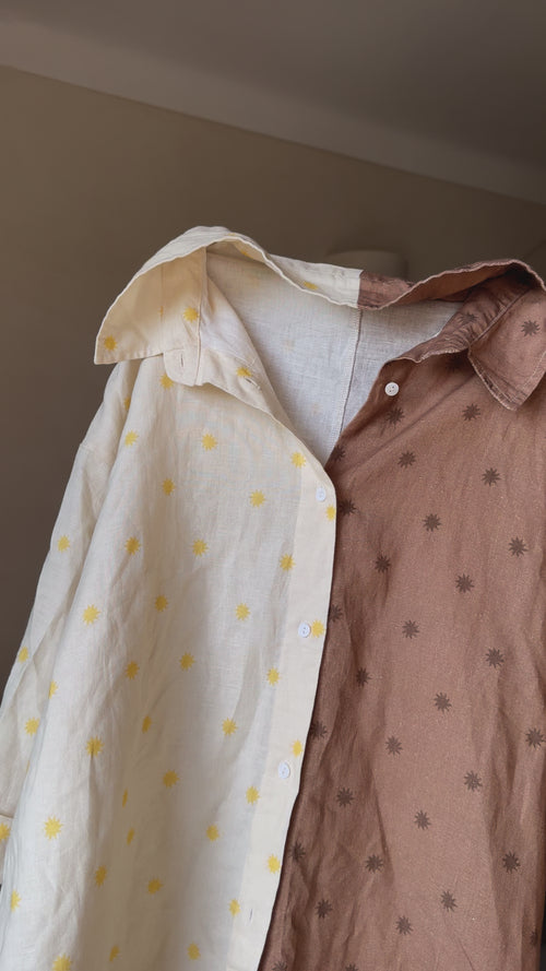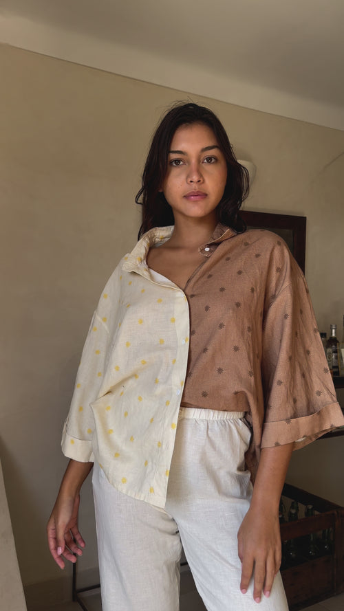 The sun print and the patchwork effect are everything we love about Nénés and perfectly represent the meeting of our two worlds with Gabrielle. To go with the shirt, we created a pair of linen shorts with the same print!