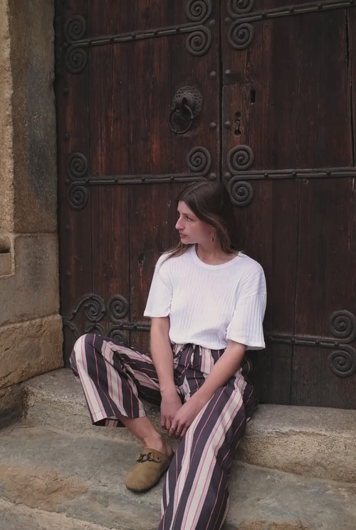 The Mathilde pants are made from organic cotton poplin. We love their play of irregular stripes in brown, plum and cream tones, perfect for lengthening the silhouette!