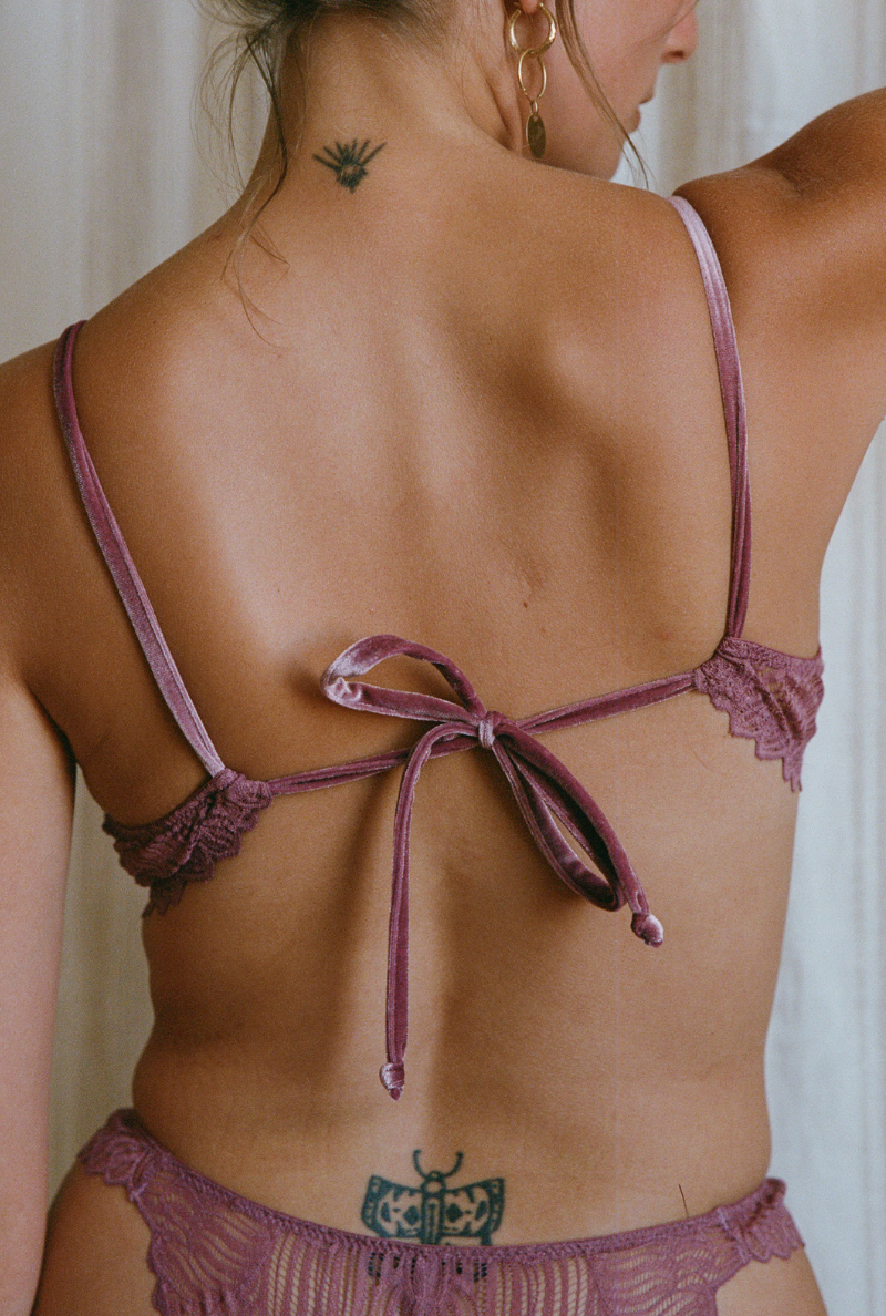 Eden, the new triangle bra in this collection, is adorned with ultra-feminine details. The plum color, velvet straps and ties, and even the botanical lace make it our little favorite for the new season.