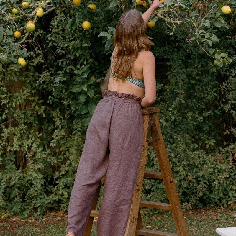 Here is Camille, in 100% linen with a pretty ruffle detail at the waist.