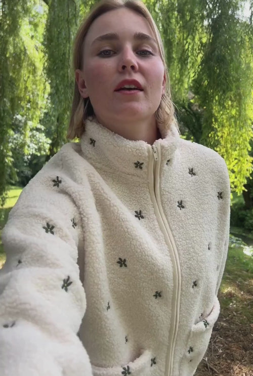 Embroidered green and yellow flowers elevate the design with delicate detail. Featuring two patch pockets at the front, a central zip fastening, and a chic stand-up collar, this fleece is as practical as it is elegant.