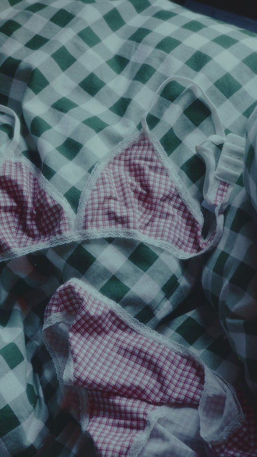 The Joséphine bra is a retro-looking model. Designed to combine softness and comfort, it is made from a very soft jersey and delicately hugs the bust. Its triangle cut and adjustable straps are ideal for wearing it all day long. We love its burgundy-red check pattern and its picot elastic detail that brings a touch of femininity!