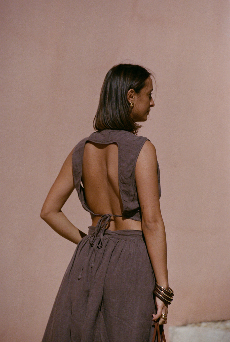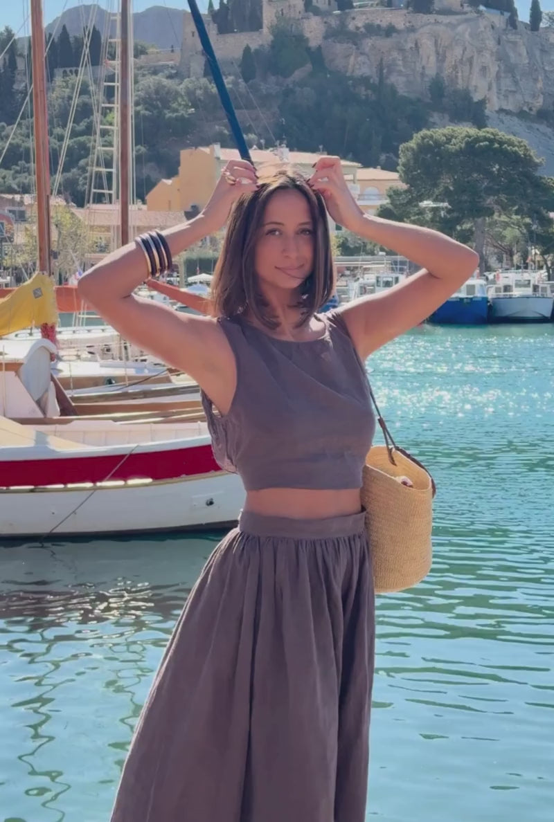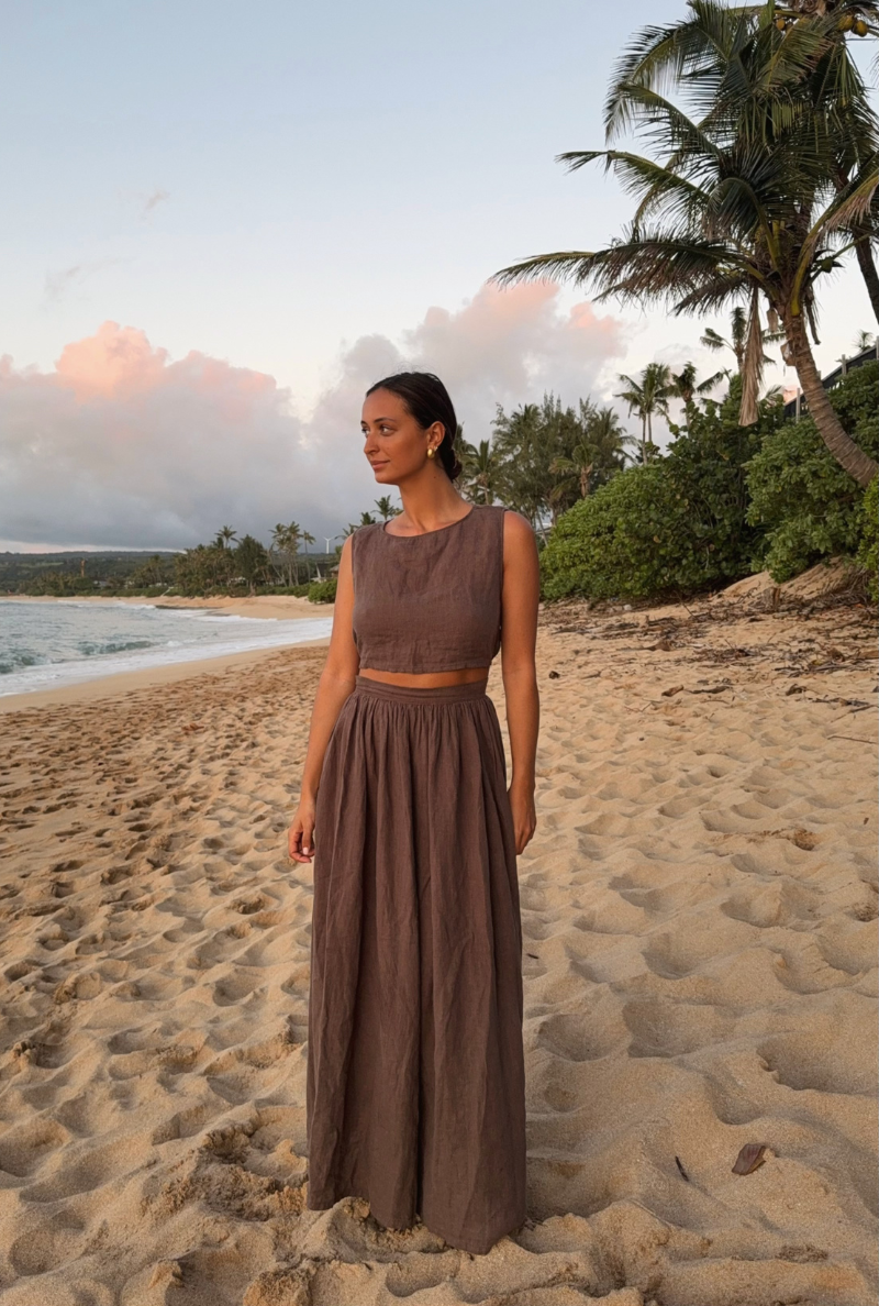POUR VOUS HABILLER CET ÉTÉ, MARGAUX ET NÉNÉS ONT IMAGINÉ UN ENSEMBLE EN LIN COMPOSÉ D’UN CROP TOP ET D’UNE JUPE DANS UN MARRON PARFAIT POUR TOUTES LES CARNATIONS !