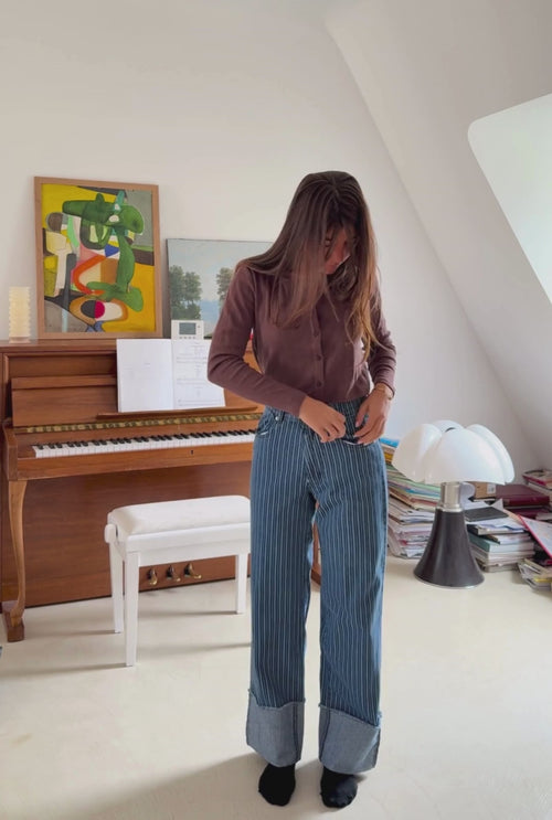 Il est décliné dans une rayure sur fond de denim qui lui donne un look travaillé et très visuel. Sa coupe allonge la jambe et tombe joliment sur le pied pour une silhouette rétro qu'on adore chez Nénés.
