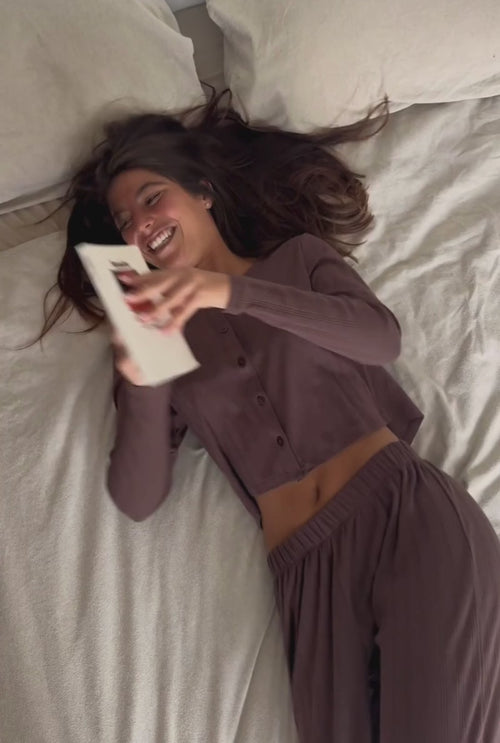 L’ensemble Maud, nouveau modèle de pyjama de la saison, se distingue par son coloris marron, apportant une touche rétro à vos tenues !