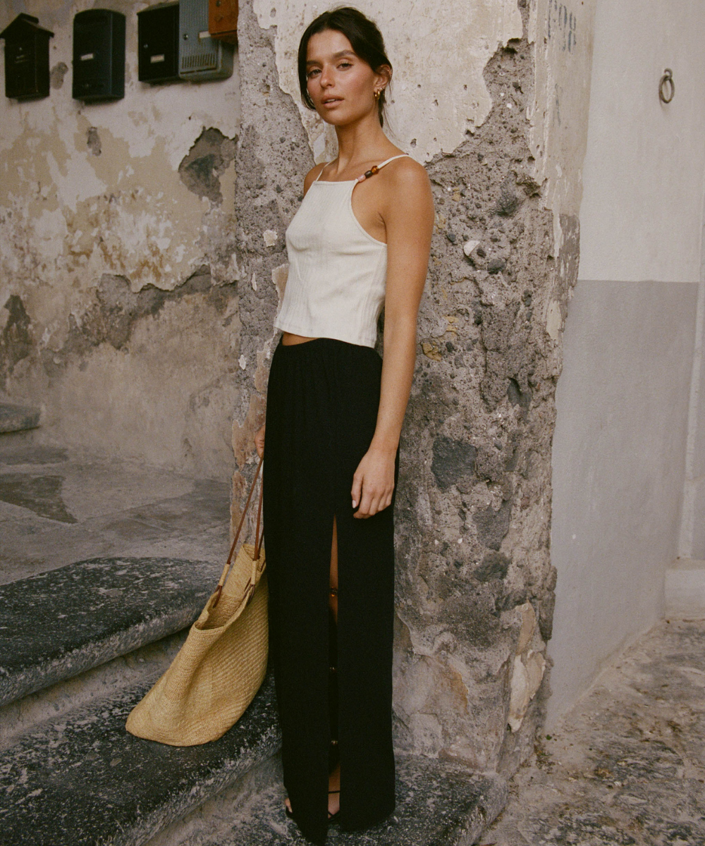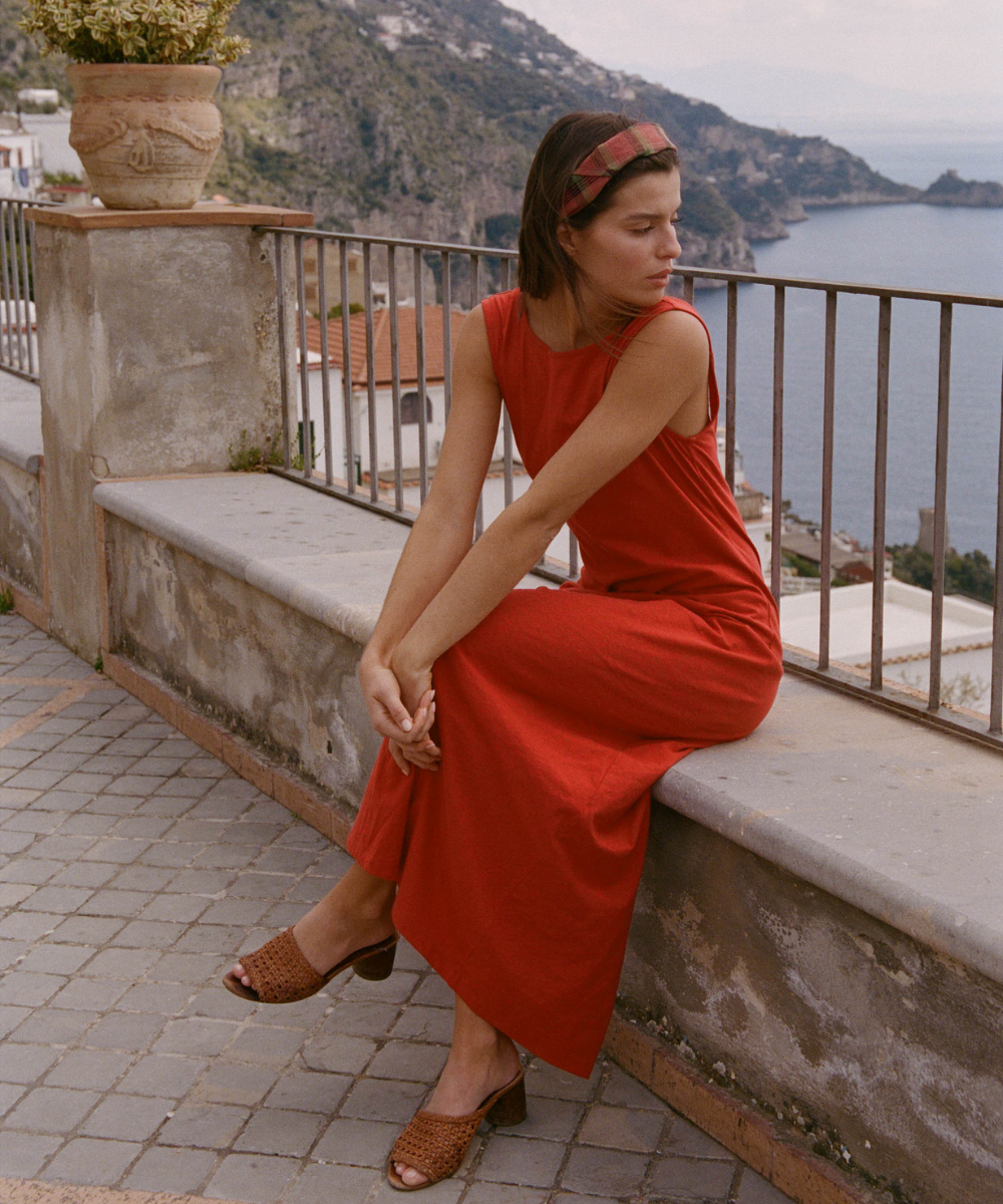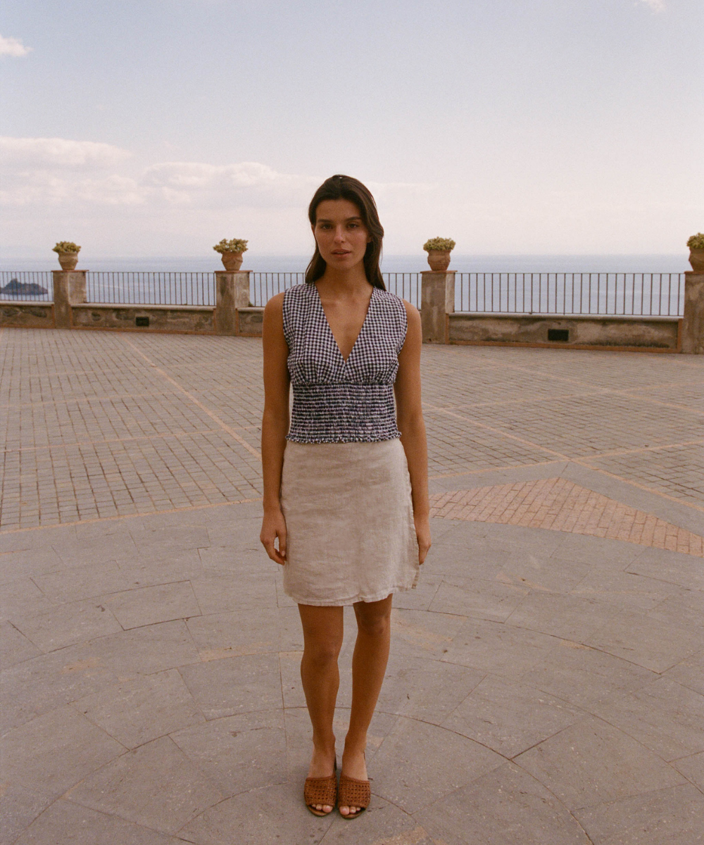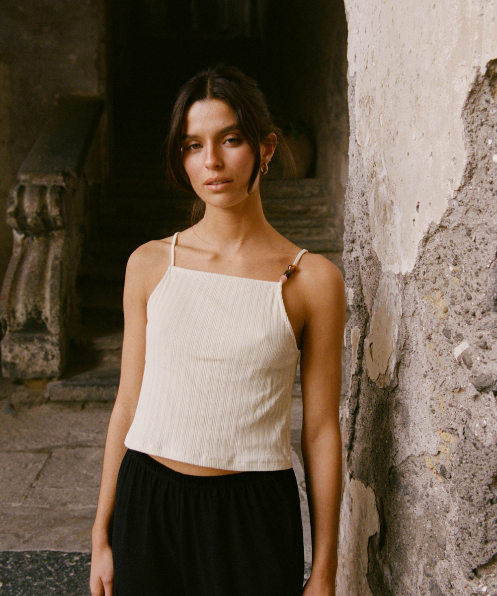 Robes fluides qui suivent les hanches, tops légers qui dévoilent un brin de peau dorée, pantalons subtilement découpés. chaque pièce est conçue pour être vécue, du matin au soir, entre criques, villages et maisons.