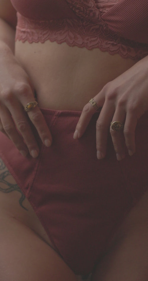 La culotte Jim est une culotte de règles flux léger taille haute en coton et dentelle fabriquée au Portugal. Le coton côtelé est 100% organique et la jolie dentelle florale dentelle vient d'Italie. Très taille haute, elle couvre bien le ventre, pour un léger effet gainant.