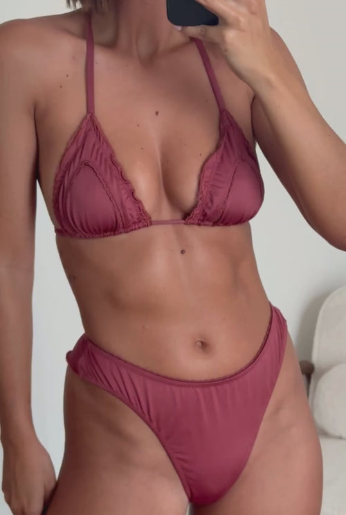 Sa coupe classique à nouer dans le cou et dans le dos épouse toutes les morphologies. Ses triangles délicatement froncés, soulignés de dentelle, offrent un joli volume naturel et un décolleté en V. Son jeu de matière ton sur ton et sa teinte terracotta irisée permet de capter la lumière à chaque mouvement.