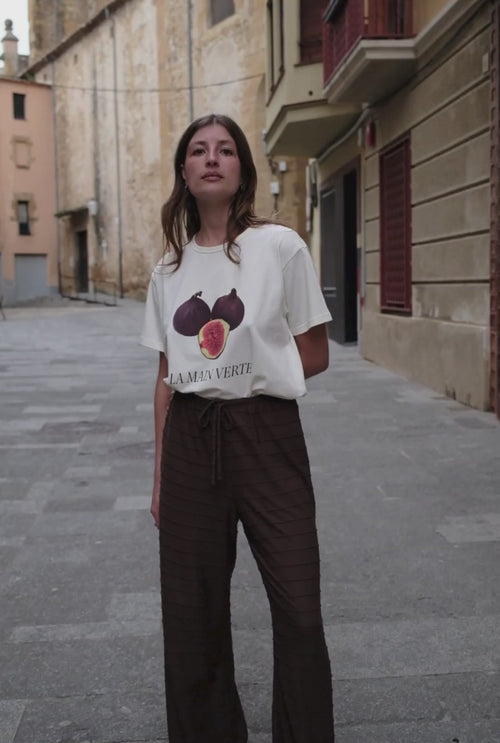 Avec sa coupe légèrement ample, ses manches courtes et son col rond il se veut aussi facile à porter que polyvalent. Son imprimé délicat met à l'honneur la nature avec de jolies figues accompagnées de la phrase "la main verte".